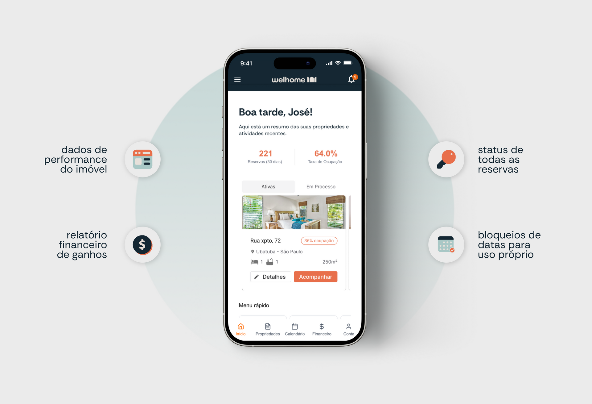 Nele você tem acesso às informações financeiras, calendário e controle de reservas do seu imóvel. Tudo na palma da sua mão.